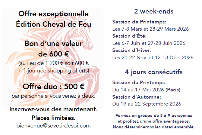 À travers des exercices pratiques et immersifs, développez votre intuition et affinez vos ressentis. Transformez votre style en un véritable allié, prêt à vous accompagner dans chaque étape de votre vie, qu’elle soit personnelle ou professionnelle.